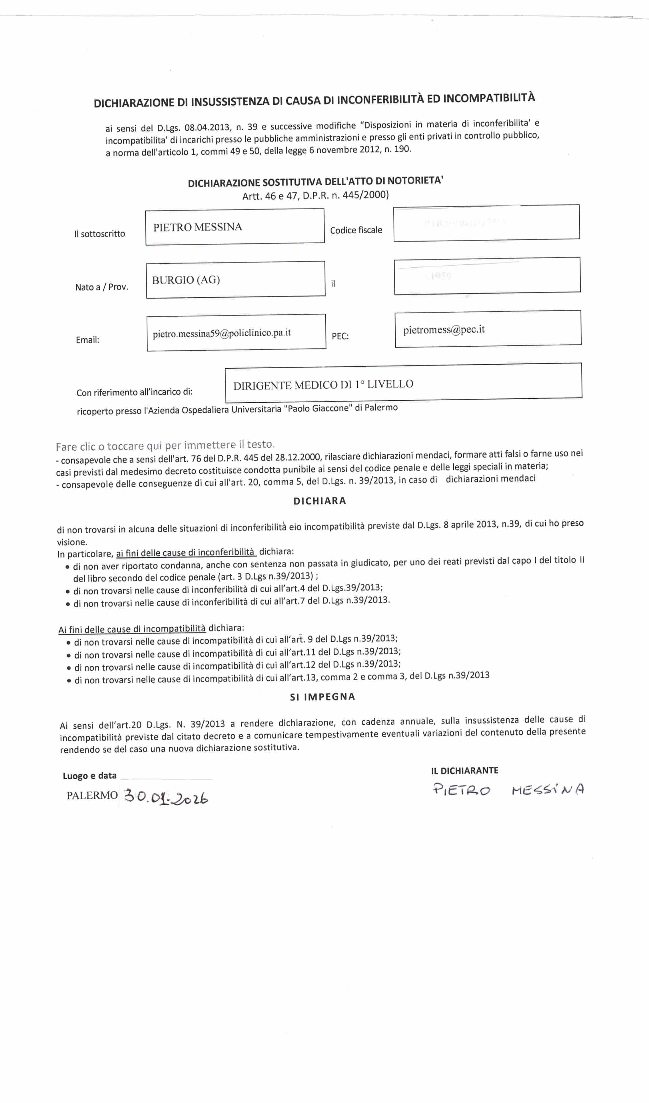 Dichiarazione di insussistenza di causa di inconferibilità ed incompatibilità - Curriculum